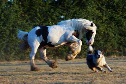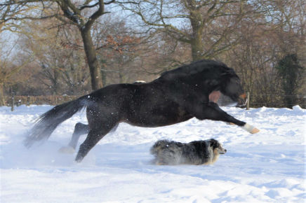 Lassen Sie ihren Hund besser nicht auf unsere Wiese laufen. Viele unserer Pferde jagen Hunde und versuchen sie zu treten. Pferde als potentielle Beutetiere und passen gut auf, dass ihnen kein Raubtier zu nahe kommt.