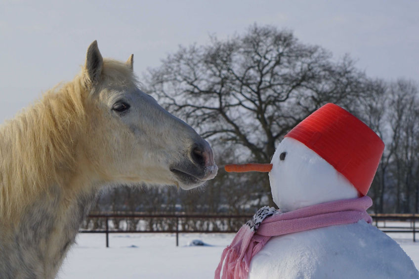 Pferde sind neugierig. Zunächst war der Schneemann für Windy gruselig. Er hat ihn erstmal von weitem beobachten, ist dann langsam näher gegangen und hat vorsichtig an der Möhre geschnuppert. Zum Schluss ist Windy der Versuchung erlegen, die leckere Möhre zu stibitzen.