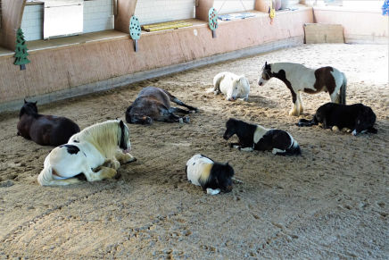 In der therapiefreien Zeit dürfen die Pferde in die Reithalle. Sie halten sich dort sehr gerne auf, zum gemeinsamen Entspannen, Toben und auch zum Schlafen. Dort fühlen sie sich sicher und haben genügend Platz. Mindestens ein Pferd schläft nicht und hält Wache, um bei Gefahr die anderen schnell warnen zu können.